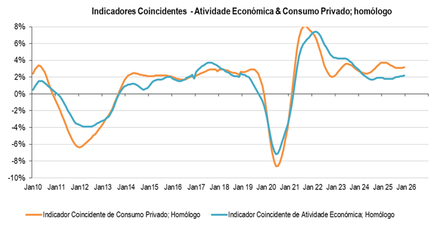 Os indicadores Coincidentes de dezembro, Consumo Privado, +3,2% homólogo e Atividade Económica 2,2%; indicam que a economia manteve um ritmo intenso no final do ano, particularmente Consumo. O indicador Diário de Atividade, apesar de mais volátil, indica que janeiro manteve o perfil positivo.
