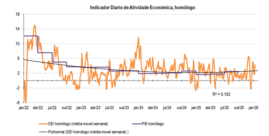 Separadamente, o BdP divulgou o Indicador Diário de Atividade (indicador semanal suportado em diversas variáveis diárias, como tráfego rodoviário de veículos comerciais, consumo de eletricidade e gás…), o qual indica dezembro, +2,3% (média) homólogo, 4T25: 2,1% e janeiro até ao momento, 2,5%.