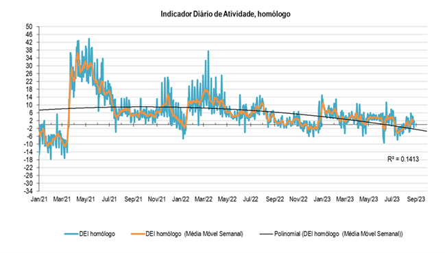 O Banco de Portugal (BdP) divulgou o indicador diário de atividade económica (DEI) (indicador publicado às quintas-feiras; “é construído com base em dados de alta frequência (tráfego rodoviário de veículos comerciais pesados nas autoestradas, consumo de eletricidade e de gás natural, carga e correio desembarcados nos aeroportos nacionais e compras efetuadas com cartões em Portugal por residentes e não residentes) e permite captar alterações na atividade económica de forma atempada”, para mais informação visite o site do BdP).