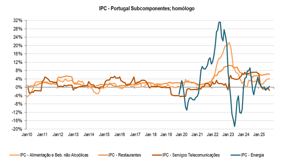 Inflação e Inflação subjacente, em setembro, 2,40% e 1,97% homóloga, respetivamente, aliviam, essencialmente, devido ao comportamento do preço dos Serviços, 3,56%. Ainda assim as principais subcomponentes mantêm um desempenho vigoroso, Alimentação, +4%; Rendas, +5%, Restauração +6,4%, exceção são os Telecomunicações, -1.41%.