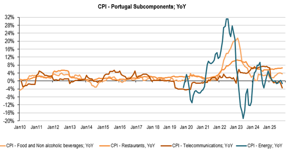Comentário: dados finais de outubro em linha com os dados preliminares, consolidando nos níveis atuais, inflação geral, junto aos 2,3/2,5%; inflação subjacente ligeiramente abaixo, enquanto inflação nos Serviços se mantém junto aos 4% e inflação nos Bens entre 1,2% e 1,5%. Entretanto, Bens de equipamento doméstico e Vestuário com deflação, enquanto no Serviços, comer fora e rendas, valores de inflação nos 5% e 6,6%, a exceção são os Serviços de Telecomunicações, -3,47% homologo fruto do aumento da concorrência no sector.
