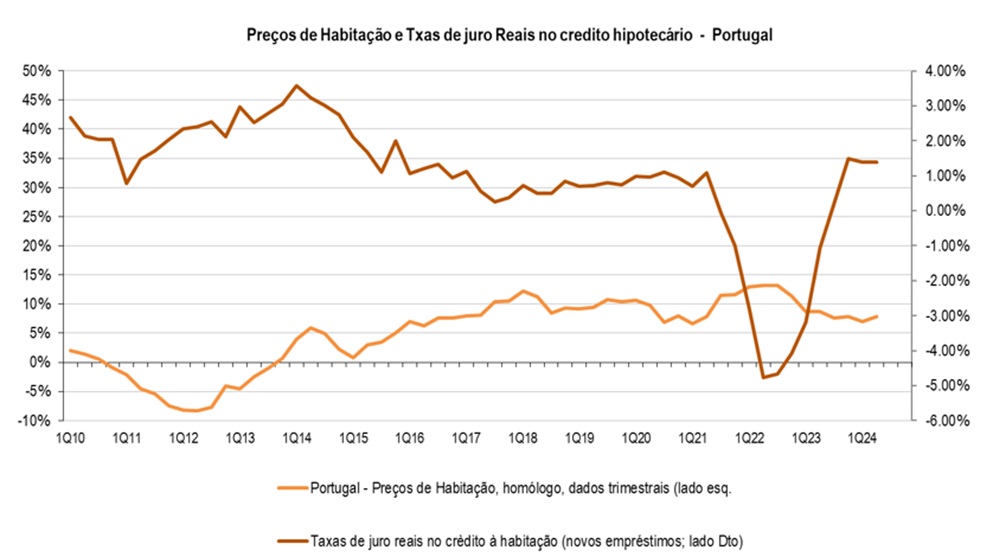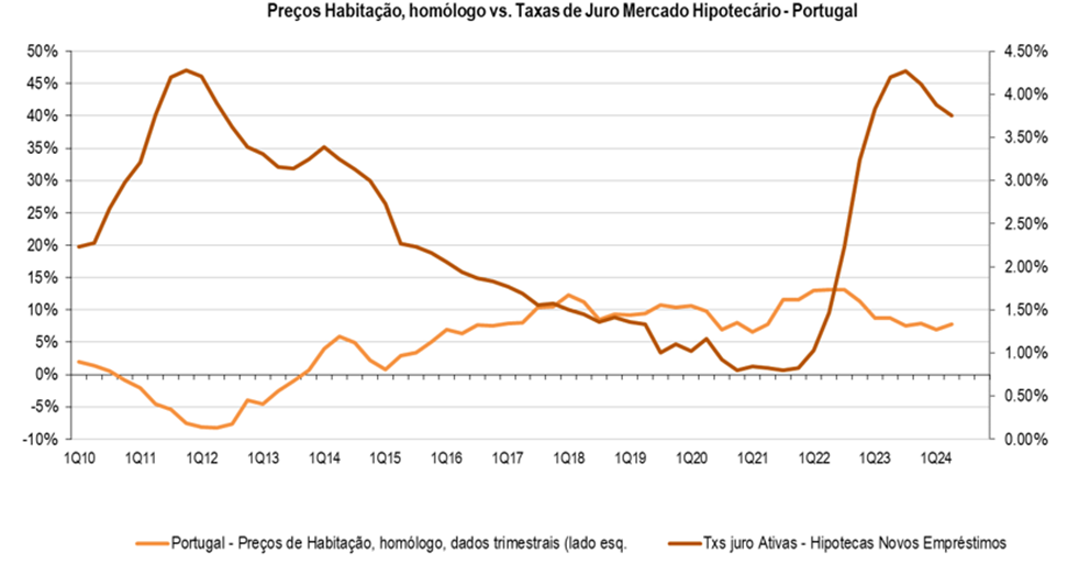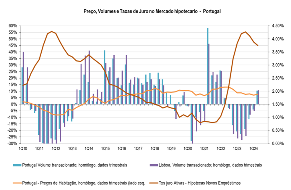 O mercado de habitação em Portugal no 2T24, reganha ritmo, preços +7,8% homólogo/+3,9% em cadeia, acima das médias móveis, acompanhado por um aumento dos volumes transacionados, +10,4% homólogo/+12,2% em cadeia (Lisboa: +10,7%/+11%). Com as taxas de juro a ajustarem, ligeiramente, de níveis elevados, a reação no mercado imobiliário foi quase automática, sendo de admitir pressão crescente nos preços do imobiliário, com a tendência de queda das taxas de juro.