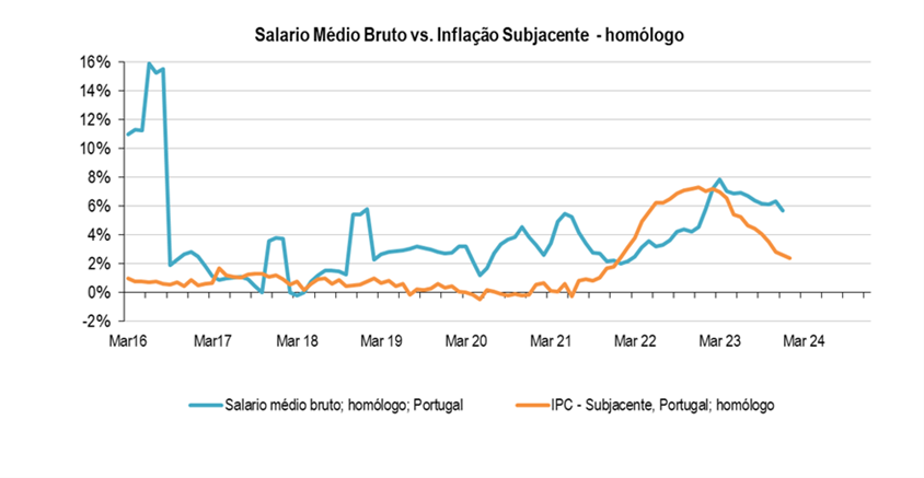 Os aumentos salariais brutos no 4T23 cresceram, em termos homólogos 6,1%; inferior aos valores registado nos trimestres anteriores, mas com ganhos mais expressivos relativos à inflação, concretamente. inflação média no 4T23: 3%. A margem positiva deverá manter-se, nos próximos trimestres, ainda que se reduzindo, aumentos inferiores e inflação estável ou a subir. Por fim, esta conjuntura deverá pressionar a procura doméstica em alta, volumes e preços, particularmente preços dos serviços.