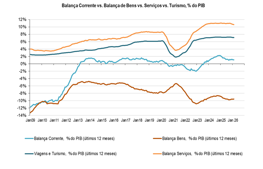 As contas externas em fevereiro, mantiveram a tendência menos favorável, a sub-Balança de Turismo registou uma variação homóloga negativa, situação invulgar. Ainda assim o saldo da Balança Corrente mantém-se positivo, devido ao défice estrutural na Balança de Bens ter estabilizado. Ajustamentos no setor do Turismo poderão provocar uma evolução do mercado de trabalho negativa.