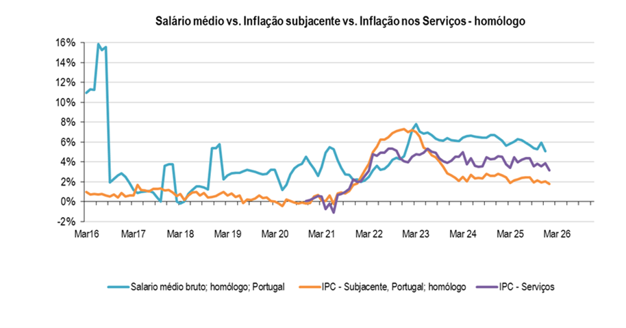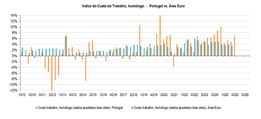 Comentário: O desempenho dos salários mantém-se resiliente, acima da inflação subjacente, cerca de 300pb base, em termos reais. Este desempenho, é um forte incentivo ao consumo, e à procura doméstica, coerente com diversos indicadores, que mostram consumo forte (vendas a retalho no 4T25, +5,2% homólogo) e pressão nas contas externas nomeadamente Balança de Bens, défice acima dos 9% do PIB. De registar também o índice do custo do trabalho em Portugal acima da União Monetária, que piora o nível de competitividade.