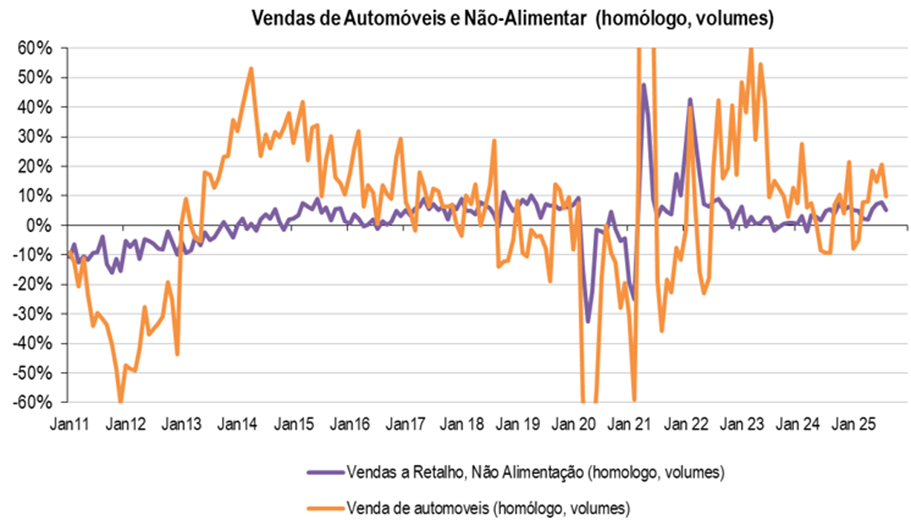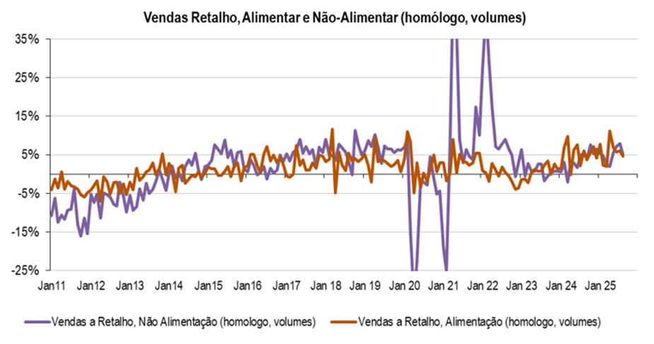 Comentário: As vendas no retalho, em volume, em agosto, mantiveram um ritmo intenso, ainda assim o crescimento homólogo inferior aos últimos quatro meses e inferior às médias móveis, mas equilibrado, não-Alimentar: 5,2% e, Alimentar: 4,6%. O efeito base é elevado durante o 4T25 (4º trimestre 2025), devido ao bom desempenho no 4T24 (efeito positivo da expansão fiscal), por conseguinte, o último trimestre do ano deverá ser menos robusto.