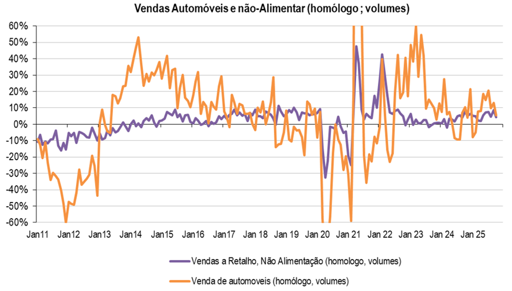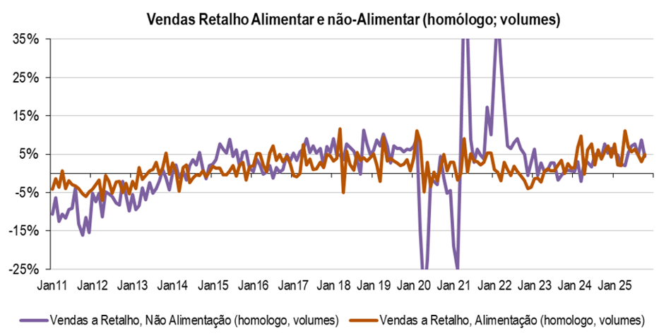 2 – “Produtos não-Alimentares” a preços constantes (sem vendas de combustível e automóveis) +4,4% homólogo vs. 12MMM: +5,3% e 3MMM: +5,9% (vendas de automóveis em outubro: +5.5%);