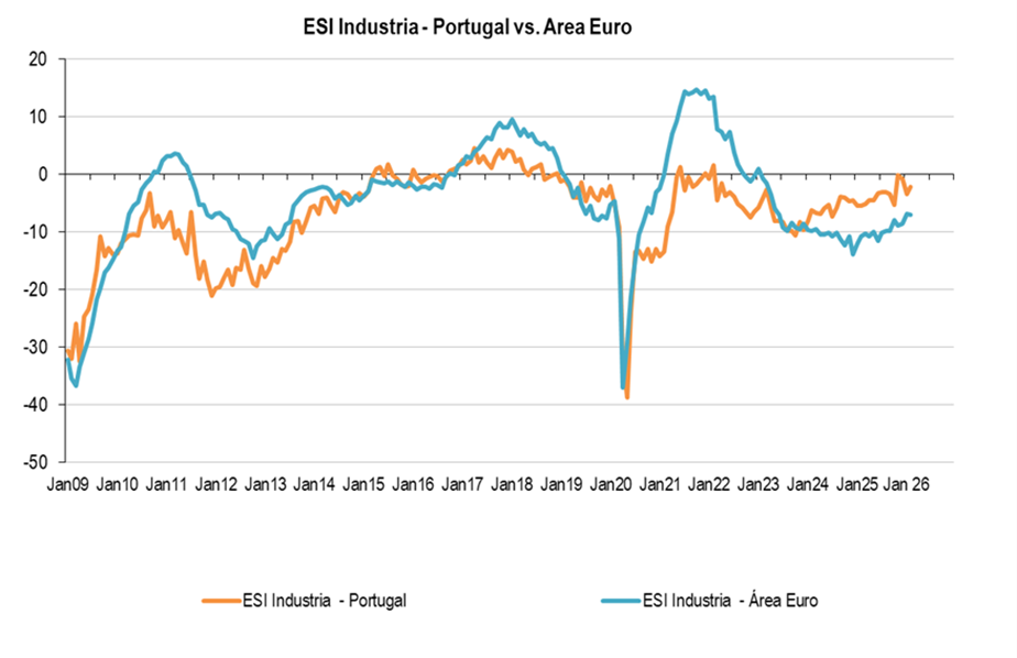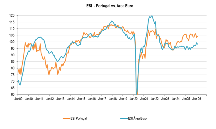 1 – O Indicador de Sentimento Económico (ESI) em fevereiro, na Área Euro, ajustou ligeiramente, depois de um desempenho forte em janeiro, -100pb, em cadeia, para 98,3 (+1,8% homólogo) vs. 12MMM (12 meses média móvel) 96,4 e 3MMM: 98,2;
