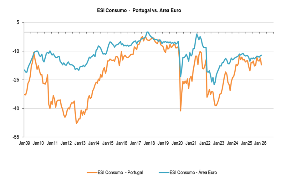 O ESI na Área Euro, em fevereiro, ajustou ligeiramente -100pb em cadeia, depois de janeiro forte, no entanto a tendência suave de subida, mantém-se intacta. Entretanto, em Portugal o ESI melhorou, +90pb em cadeia; depois de janeiro fraco, os dados mantêm-se voláteis. Por último, o impacto das tempestades, mantém-se, genericamente, ausente, exceto a Confiança dos Consumidores, que ajustou 350pb em cadeia
