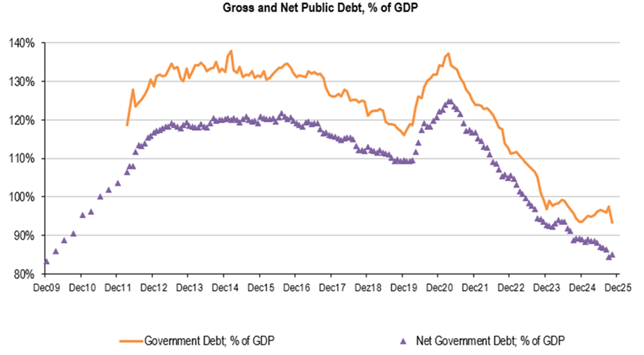 1 – Gross Government debt (Maastricht definition): €283,146Mn; +491bpYoY/-308bpMoM and 93.2% of GDP last 12months vs 12MMA (12 Months Moving Average): 95.2% and 3MMA: 95.5% (target YE25: 90.2%);