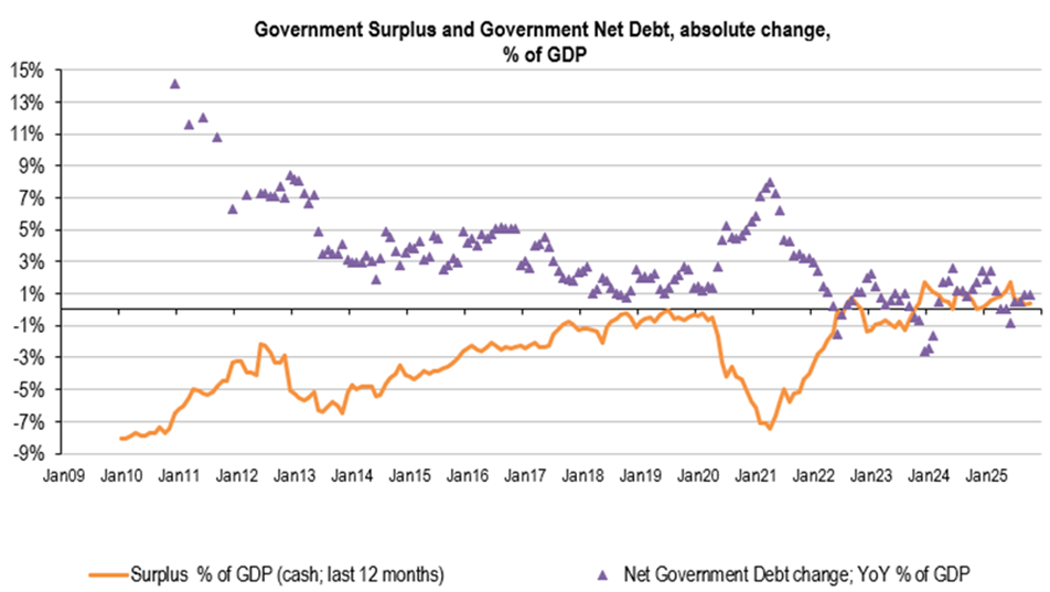 Quick Comment: the budget execution, keeps performing, surplus on a cash basis +€4.1Bn YtD (until October) and roughly +€830Mn above October 2024. Nevertheless, budget execution is usually negative in the last 2 months of the year (Christmas month extra salary and pension), so, according to budget execution in 2024 and average of the last two years, current surplus €4.1Bn should come down and finish the year finish between +€2Bn and €3Bn, on a cash basis. Meanwhile, government debt, Maastricht definition is now roughly at 93.2% of GDP vs. government target YE25; 90.2% and after a positive performance in October. As we mentioned before, it’s mainly Deposits that are coming down, so it should continue to adjust in November and December, currently €25Bn, to reach the target of 90.2% of GDP or below.