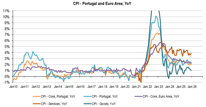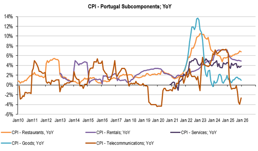 Quick Comment: CPI Portugal final data – December’s CPI: 2.19%YoY (Core 2.05%), o/w - Services inflation 3.86%; in line with moving averages and Goods inflation 0.98%; below moving averages. Inflation at Services, more labour intensive, remains high, because of the robust job market and wages, namely minimum salary (2026: +5.75%). The current environment should remain in place, or it could intensify, as the job market is becoming tighter.