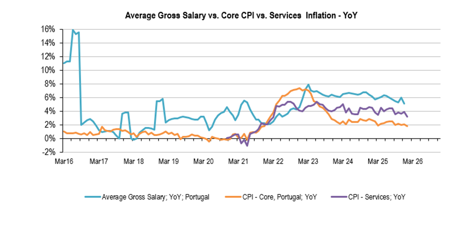 Our comments: Nominal wage increases are smoothly adjusting, 5.1%YoY in December, the lowest figure since December 2022. The trend is negative, smaller increases, however as inflation is slightly above 2%, real wage increases remain around 3%; which is a strong incentive to the domestic demand and consumption, while the Goods balance remains strongly negative, above 9% of GDP. Finally, the labour cost index in Portugal remains above the Euro Area, which is negative in terms of competitiveness.