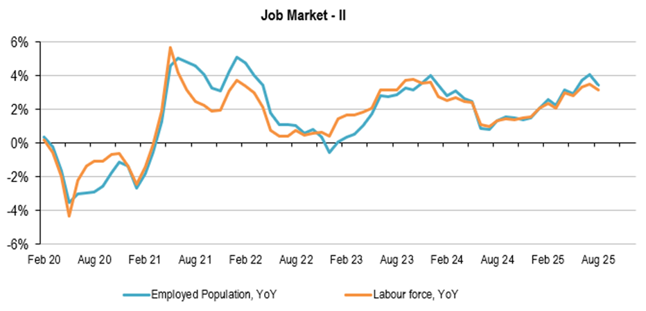 Summing up, the job market in August, slightly adjusted, the unemployment rate increased 13bpMoM to 6.09%. Nevertheless, Employed population and Active population, +3.4%YoY and 3.1%YoY, respectively, continue to show strong growth. The new immigration rule, should, first impact the Active population…
