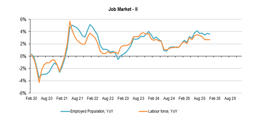 Summing up, the job market in December kept the recent trend, namely Employed population growing above Active population so unemployment rate continues to adjust, 5.59% a new recent low. We foresee this trend to remain in place over the coming months, as the new immigration policies should slowdown the growth rates of the Active population. Meanwhile, in 2025 the Employed population grew 3.6%YoY, while the GDP would grow around 2%; a strong negative impact in terms of productivity.