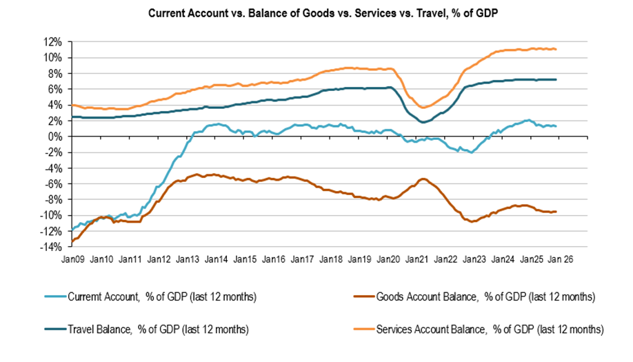 4 – Travel Account Balance (just tourism revenues, net; a subcomponent of Services Account Balance) surplus is at +7.2% of GDP (last 12M) vs. 12MMA: +7.2% and 3MMA: +7.2%;