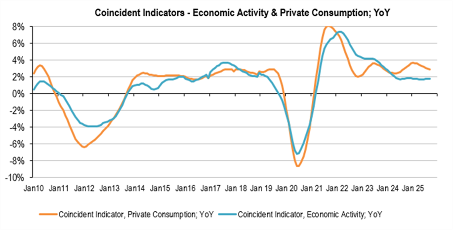 Our comments: September Coincident Indicators released yesterday evening (past data was reviewed slightly upwards), continue to show Private Consumption outperforming, +2.9%YoY, despite slightly below moving averages, while the general indicator, Economic Activity remains less strong, +1.8%YoY, in line with moving averages (please see graphs below).