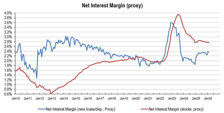 • Net Interest Margin (new Loans/new deposits, proxy): +2.36% vs. Stock: 2.76%; and compares with 12MMA +2.32%/3MMA 2.32%.
