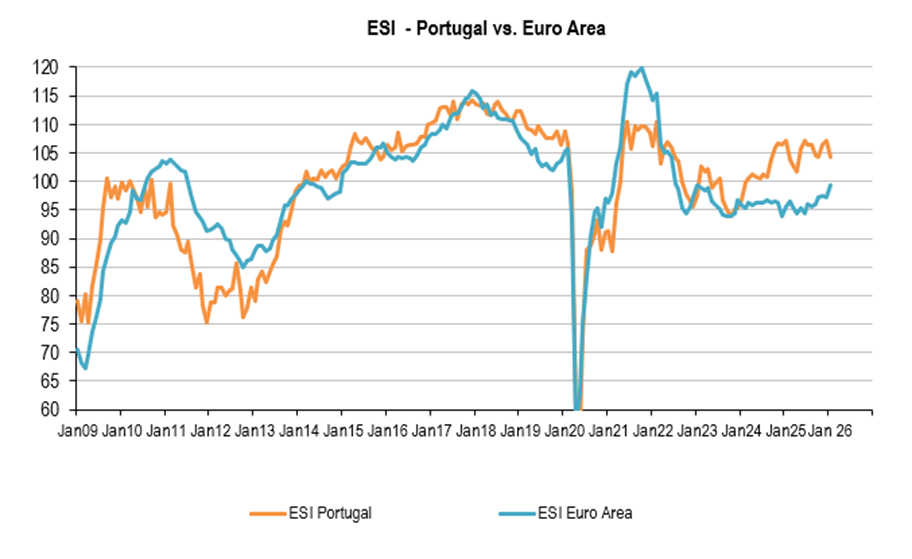 Summing up, the Euro Area ESI in January, surprised +220bpMoM, to 99.4 (+4%YoY), above the moving averages, Industry and Services, both improved sequentially. Meanwhile, in Portugal, the ESI, in January underperformed -300bpMoM…