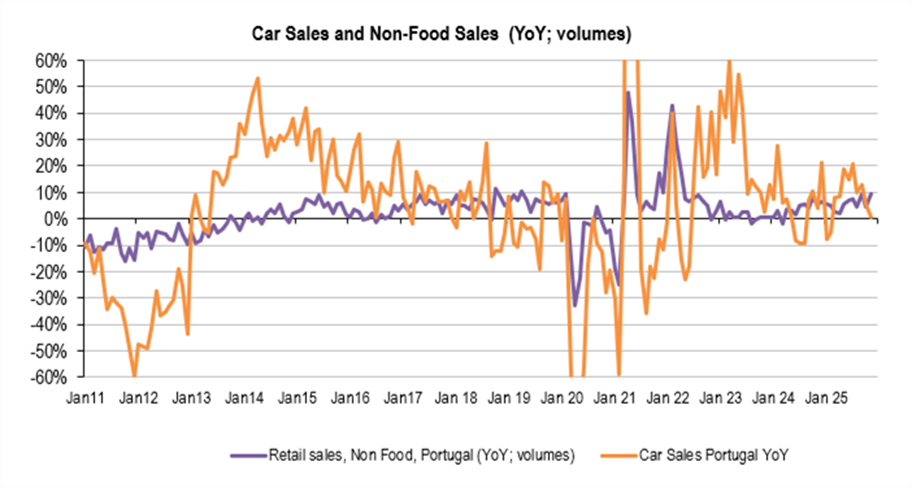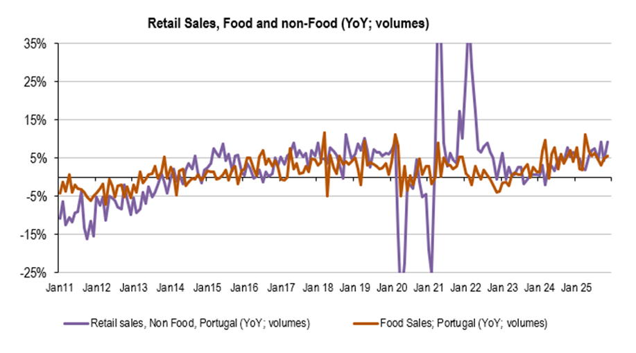 Summing up, Retail Sales in November, volumes (without service stations and car sales): +7.6%YoY, quite strong data, above moving averages; o/w, Food: +5.5% above moving averages and non-Food +9.2%, also above moving averages (seasonal adjusted data was also quite strong). So, after a strong 3Q25, the last quarter of the year is also pointing to a strong performance, Food, and non-Food. The high base effect in October/November did not prevent data to outperform, so December should be also quite strong.